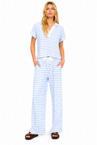 This breezy set brings effortless, coastal charm with its soft striped design and relaxed silhouette. The short sleeve top features a laid-back fit with a subtle V-neckline and collar detail, giving it a casual yet polished feel. The matching pants are designed with a comfortable elastic waistband and adjustable drawstring, finished with a flowy wide-leg fit for easy movement. Lightweight and perfect for warm days, this set is ideal for lounging, beachside strolls, or casual outings with a fresh, seaside vibe.