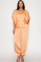 This chic set pairs a dolman sleeve blouse with a beaded V-neckline and gathered waist for a soft, flattering fit. The matching high-waisted joggers feature a tapered leg, elastic waistband, side pockets, and adjustable ankle ties for all-day comfort and style. Effortless, versatile, and easy to wear.