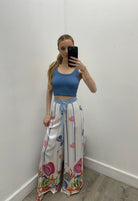 These wide-leg pants bring a playful, coastal-inspired vibe with their colorful ocean motif and soft striped design. Featuring a high-rise fit with an elastic waistband and adjustable drawstring, they offer both comfort and a flattering silhouette. The flowy fabric moves effortlessly, making them perfect for warm days, beach outings, or relaxed vacation styling. Fun, breezy, and eye-catching, these pants are made to stand out.