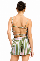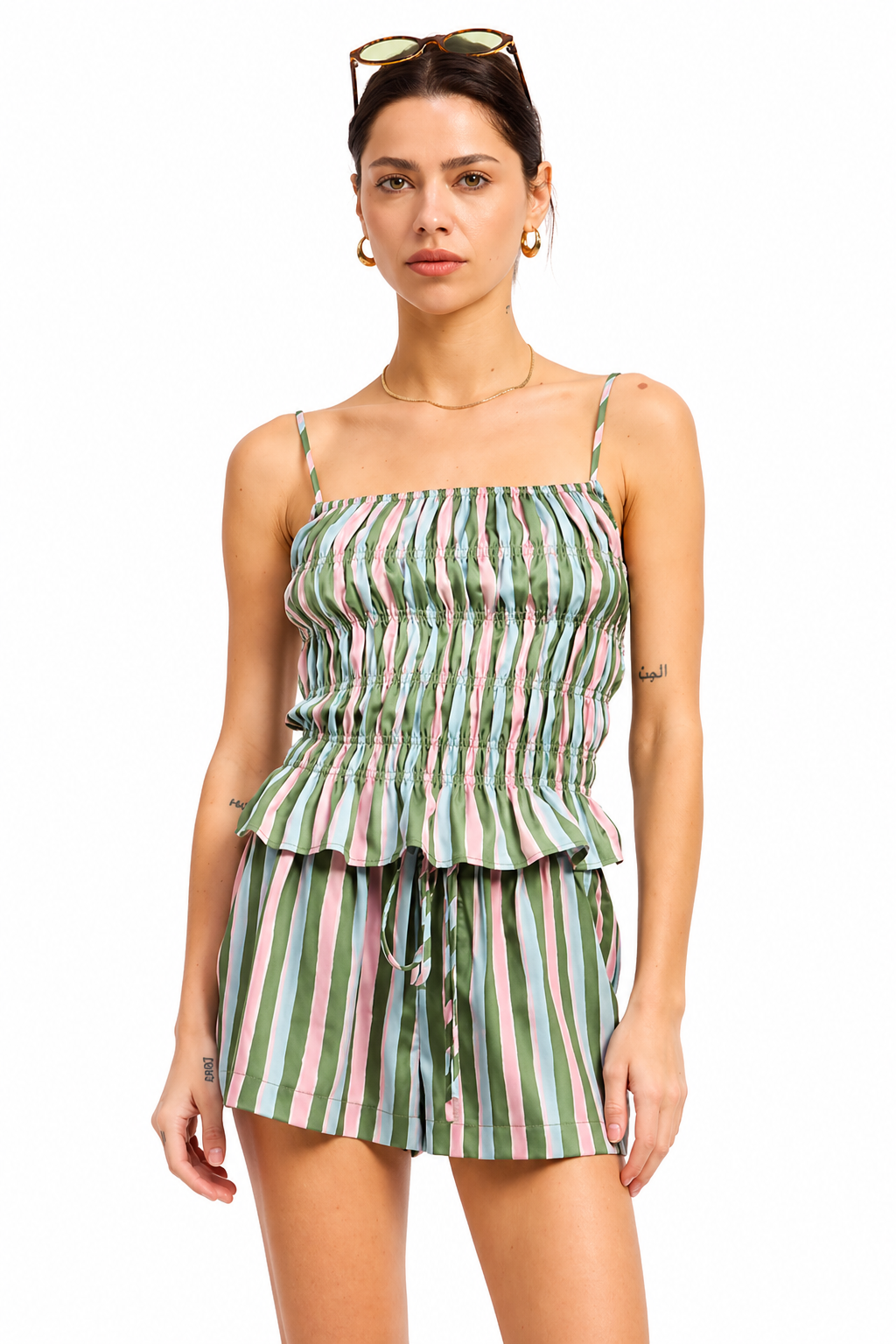 This playful short set features a fresh striped design that brings a fun, summery vibe to your look. The smocked top is designed with delicate spaghetti straps and a flattering, fitted silhouette, while the open back with adjustable strap detailing adds a bold, eye-catching touch. The matching high-waisted shorts offer a relaxed fit with an easy drawstring waist for all-day comfort. Lightweight and effortlessly chic, this set is perfect for warm days, vacations, or casual outings.