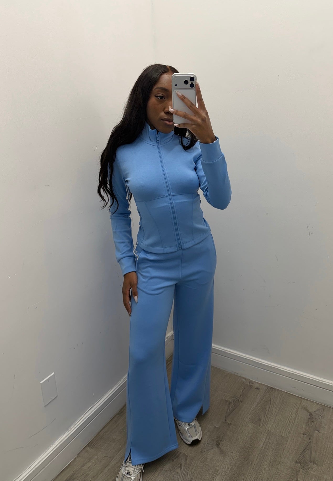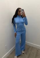 This sleek activewear set combines sporty style with a flattering, sculpted fit. The zip-up jacket features a high neckline and contoured seams that enhance the silhouette while providing a snug, comfortable feel. The matching high-waisted pants are designed with a wide-leg fit for effortless movement and a modern edge. Crafted from a smooth, stretchy fabric, this set is perfect for workouts, errands, or elevated athleisure looks.