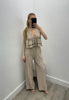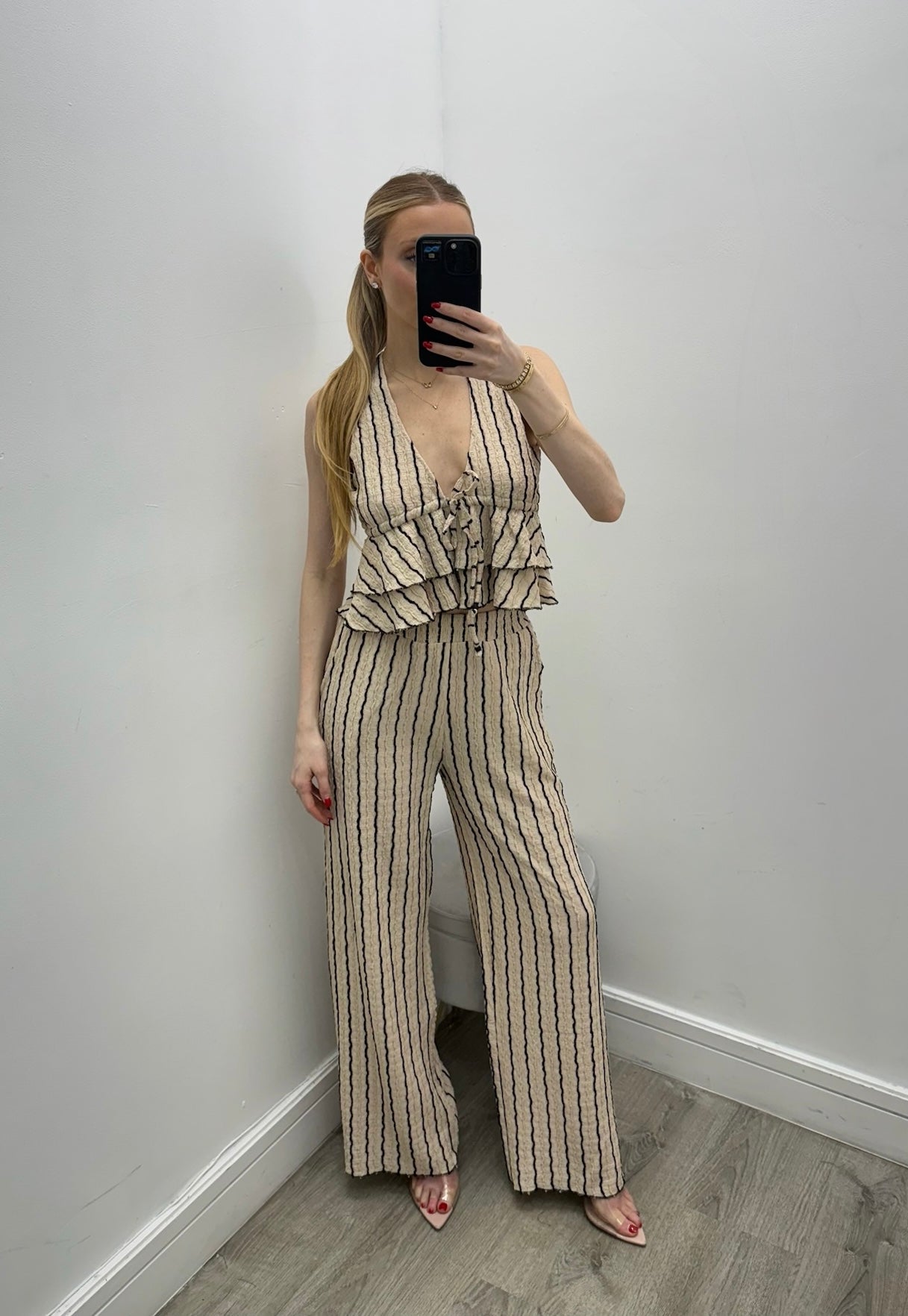 This effortlessly chic pant set features a textured striped design that adds subtle dimension and a modern edge. The sleeveless top is designed with a flattering V-neckline and lace-up front detail, finished with a soft ruffle hem for a feminine touch. The matching high-waisted pants offer a relaxed, wide-leg silhouette that flows beautifully for all-day comfort. Perfect for warm days, vacations, or casual outings, this set blends easy style with elevated detail.