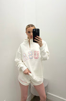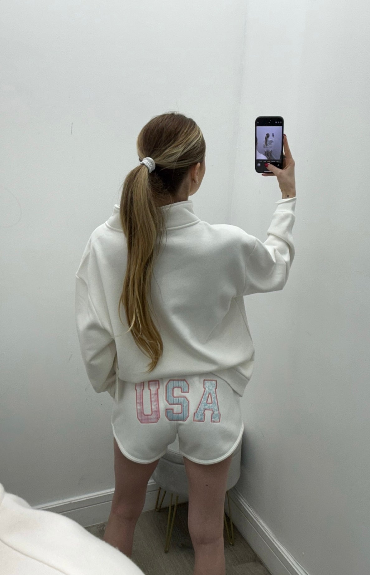 This cozy short set combines laid-back comfort with a sporty, Americana-inspired vibe. The oversized sweatshirt features a half-zip neckline and bold “USA” lettering across the front, giving it a relaxed yet statement feel. The matching shorts are designed with an easy elastic waistband and a comfortable fit, finished with coordinating “USA” detailing for a playful touch. Soft, effortless, and perfect for lounging or casual days out, this set is your go-to for cozy style with a standout edge.