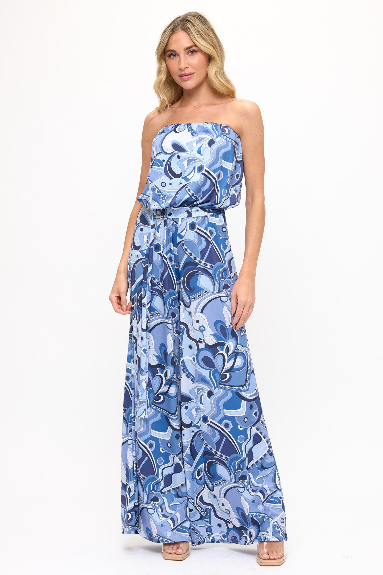 Flowy, vibrant, and effortlessly elegant—this strapless jumpsuit is made to stand out. Featuring a bold blue abstract print, it brings a fresh, eye-catching feel to your look. The blouson-style top and adjustable waist tie create a flattering, defined silhouette, while the wide-leg design offers graceful movement and all-day comfort. Lightweight and versatile, it’s perfect for vacations, daytime outings, or dressed-up evening plans.