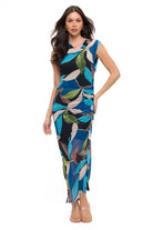 This stunning midi dress features a bold, abstract print that brings vibrant color and modern elegance to your look. Designed with a sleek, figure-hugging silhouette, it showcases flattering ruching along the side that enhances your shape while adding soft texture. The asymmetrical neckline creates a contemporary, eye-catching detail, while the lightweight fabric drapes beautifully for effortless movement. Perfect for evenings out, special occasions, or statement moments, this dress is both chic and unforgettable.