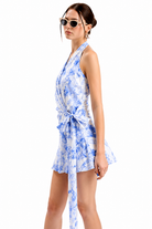 This chic mini dress features a soft blue and white print that brings a fresh, timeless feel. Designed with a flattering halter neckline and an open back, it creates an effortlessly elegant silhouette. The wrap-style front is finished with a side tie detail that cinches the waist for a customizable fit, while the flared hem adds a touch of movement and femininity. Perfect for warm days, vacations, or brunch outings, this dress is light, stylish, and easy to wear.