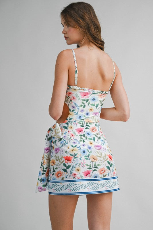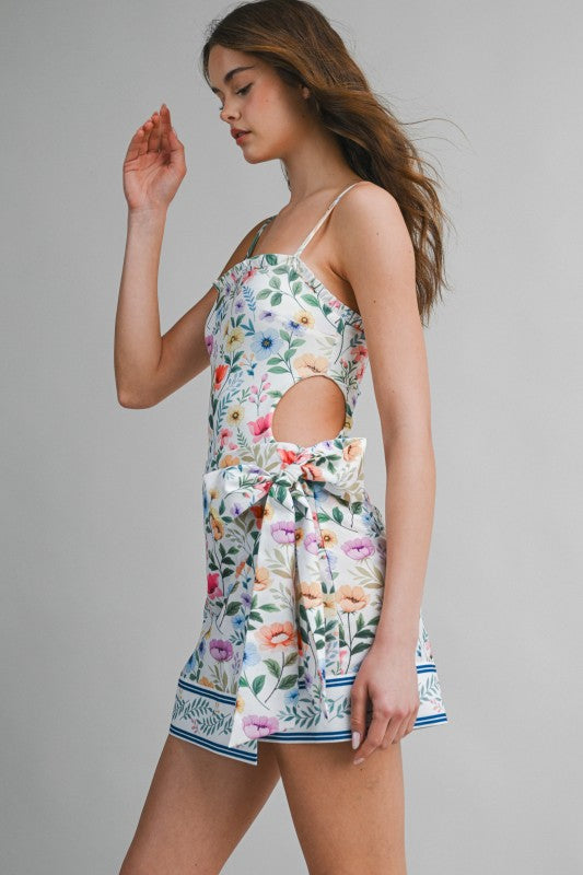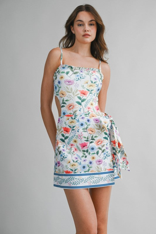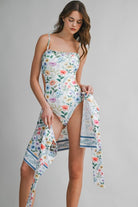 This charming two-piece swim set features a delicate floral print that feels fresh, feminine, and perfect for sunny days. The one-piece swimsuit is designed with a flattering straight neckline and adjustable spaghetti straps for a comfortable, secure fit, while subtle side cutouts add a modern touch. Paired with a matching wrap skirt, finished with a side tie and a coordinating border print at the hem, this set transitions effortlessly from poolside lounging to beachside strolls. Pretty, polished, and vacation-ready.