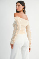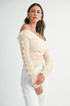 Turn heads in this effortlessly chic off-the-shoulder top crafted from a soft, slinky knit fabric that drapes beautifully over the body. The ruched detailing flatters your silhouette, while the ruffle-edge long sleeves add a touch of romantic flair. Perfect for a night out or a polished daytime look, this solid-colored statement piece pairs perfectly with high-waisted jeans or a sleek skirt for a sophisticated finish.
