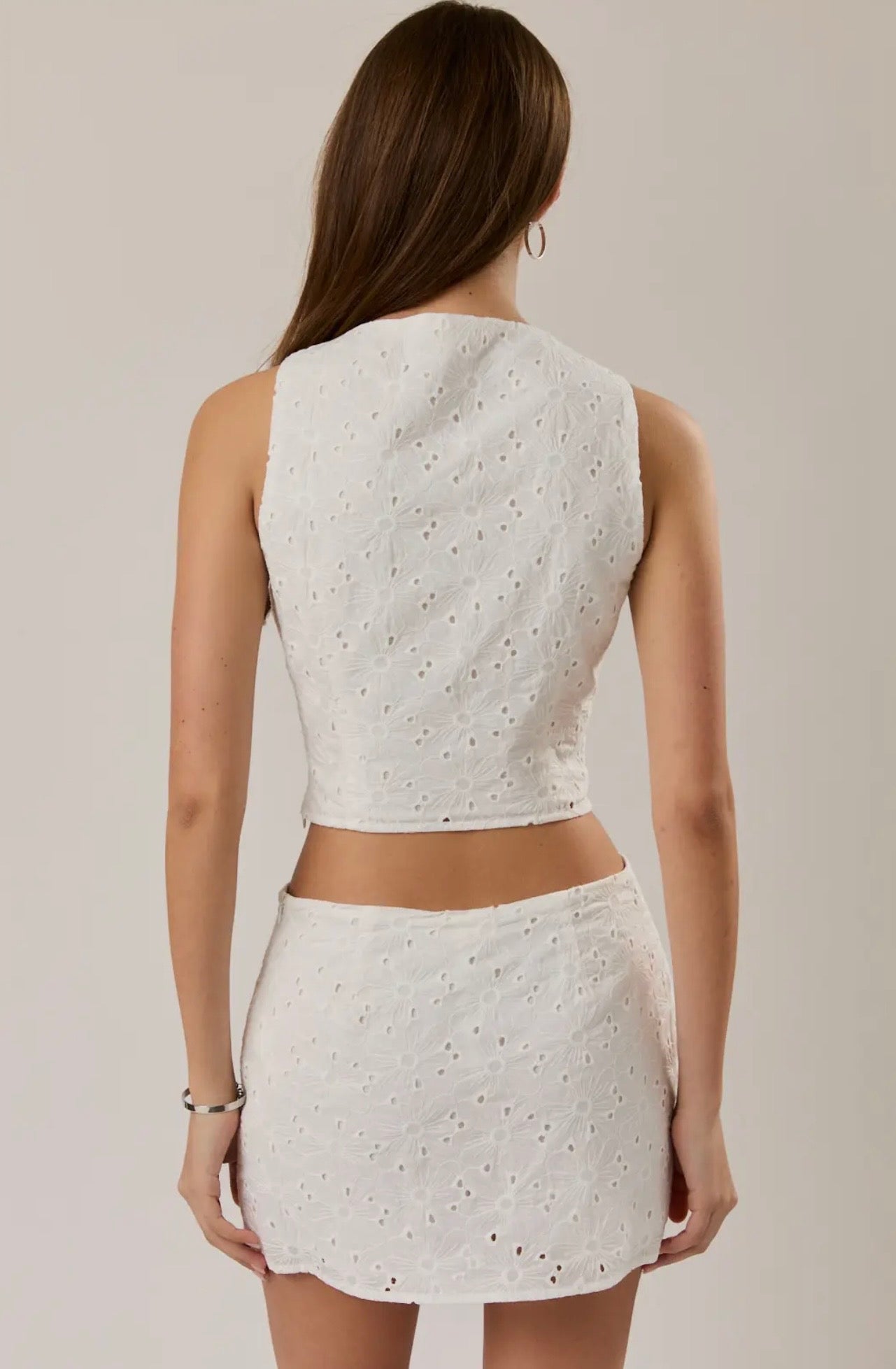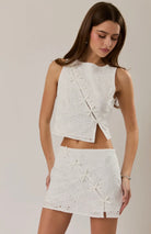 Fresh, feminine, and effortlessly chic—this two-piece set is a standout for warm-weather styling. Crafted in delicate eyelet fabric, it features a sleeveless cropped top with subtle front tie details and a modern, structured silhouette. The matching mini skort mirrors the intricate design with coordinating tie accents, creating a perfectly polished look. Light, breathable, and easy to wear, this set is ideal for brunch dates, vacations, or any occasion where you want to look effortlessly put together.