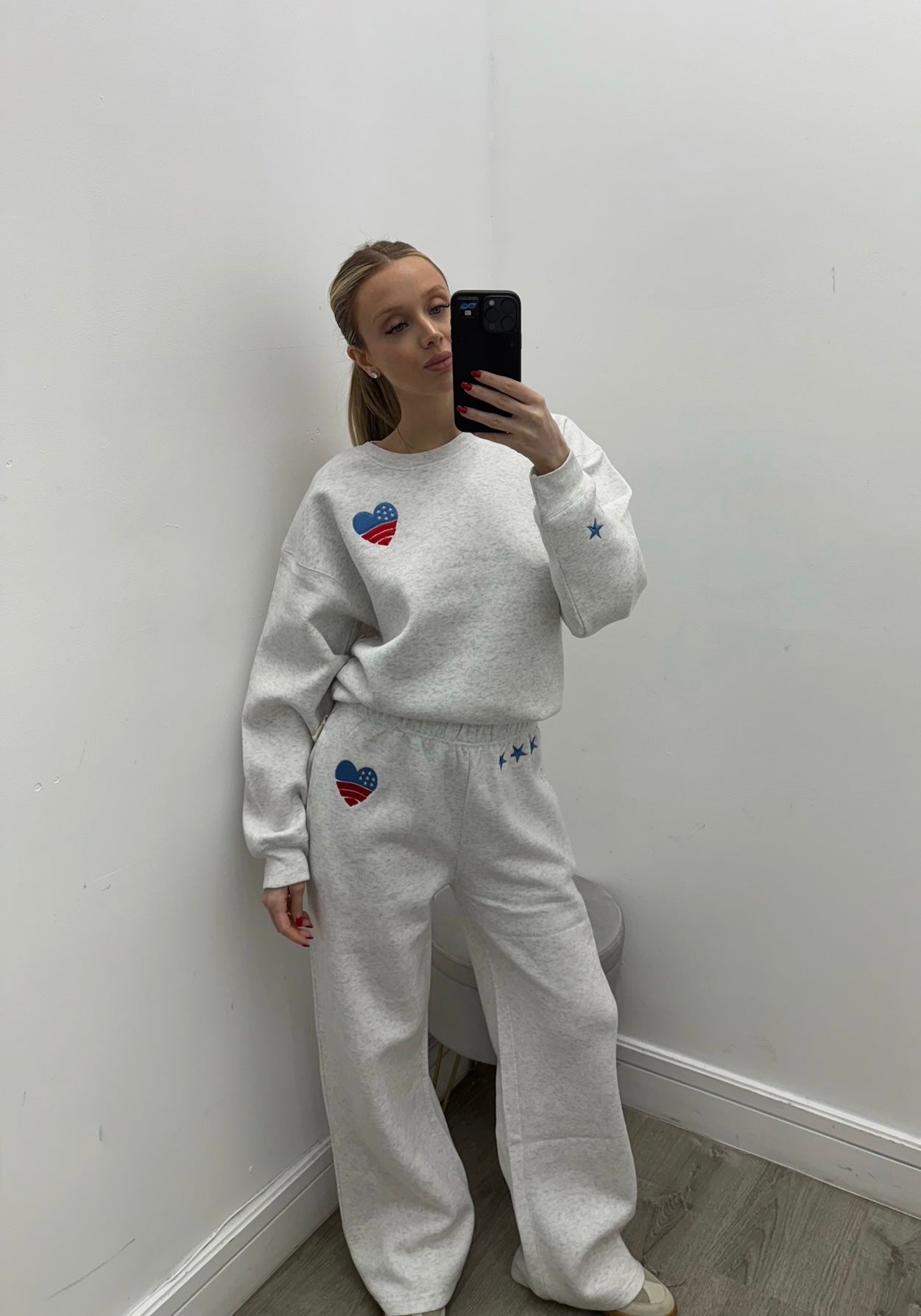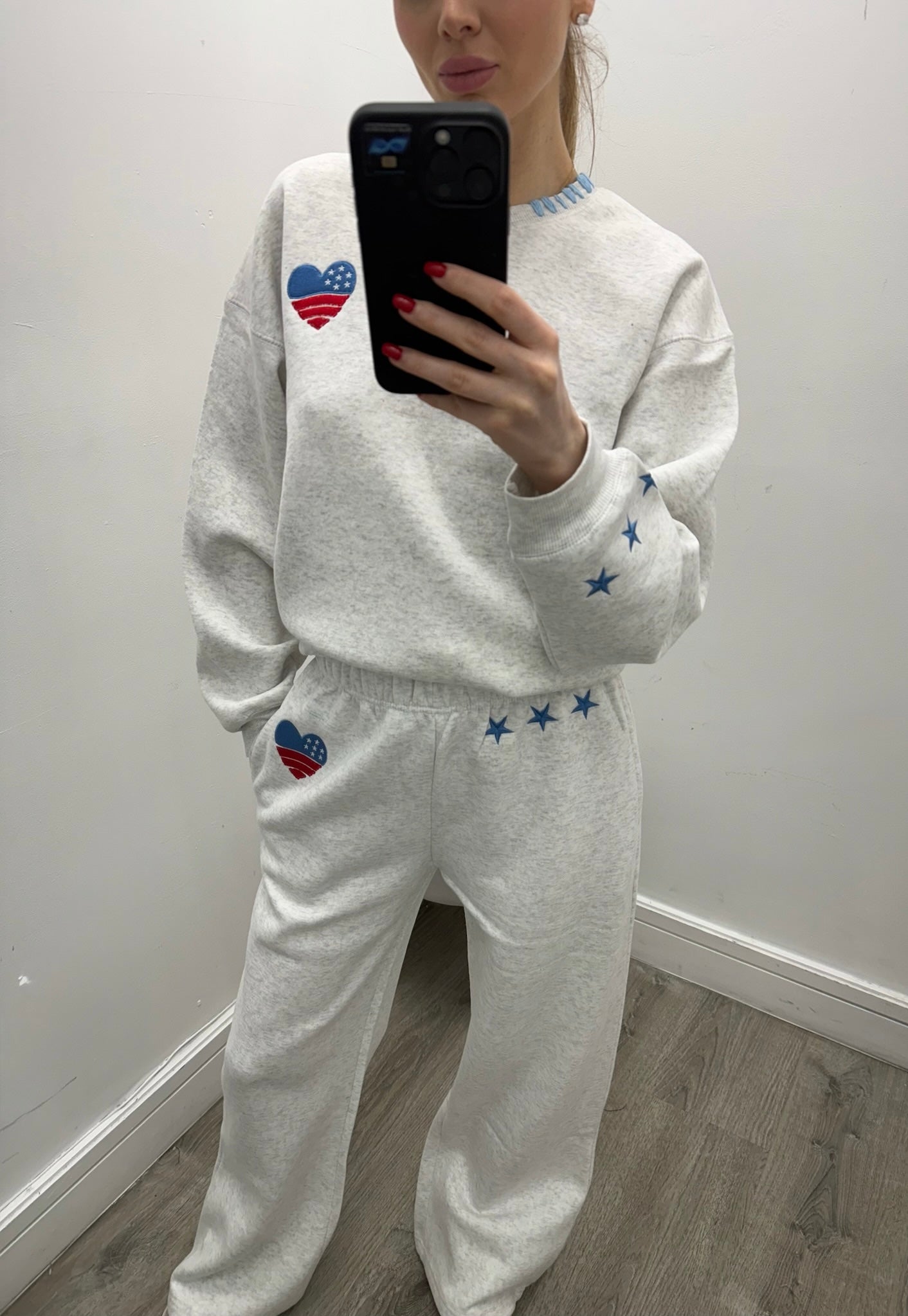 This cozy lounge set combines comfort with a playful, sporty touch. The relaxed-fit sweatshirt features a classic crew neckline and soft fleece feel, accented with a heart graphic in a bold, Americana-inspired design. The matching sweatpants offer a comfortable elastic waistband and a relaxed, wide-leg fit, finished with coordinating heart and star details for a fun, standout look. Perfect for lounging, running errands, or casual days out, this set delivers effortless style with all-day comfort.