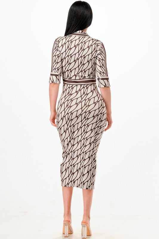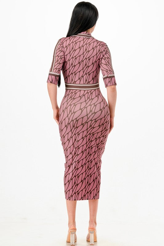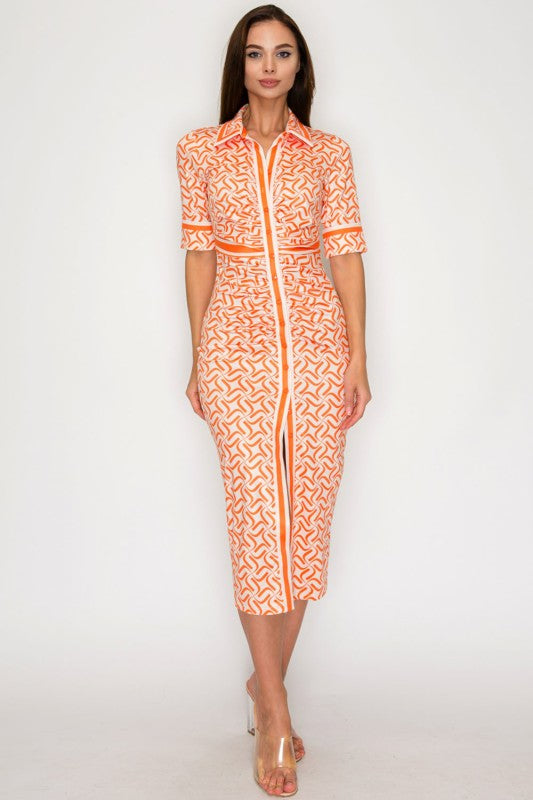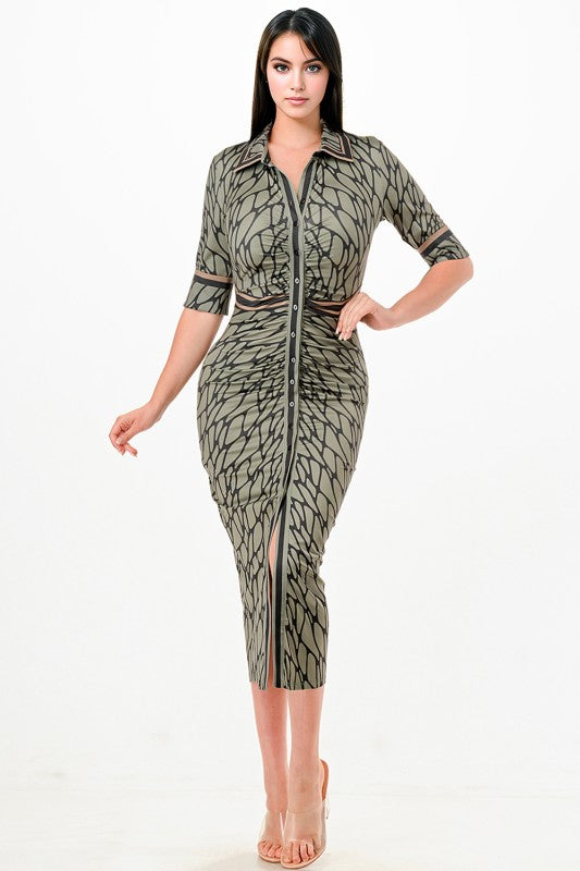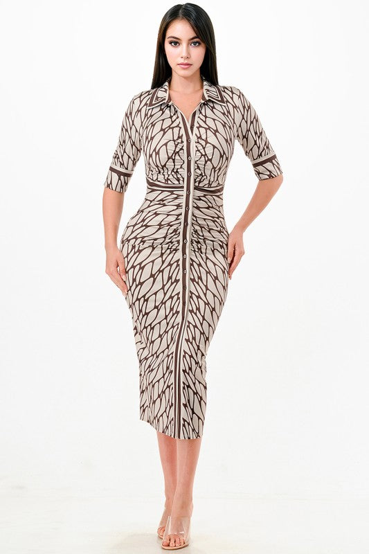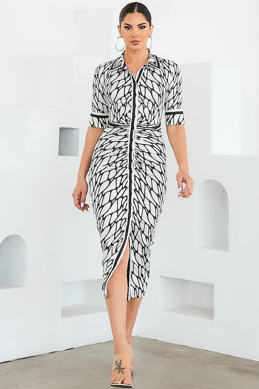 This collared, button-down midi dress is made from a soft, stretchy knit fabric. A front slit adds a touch of flair, while half sleeves with cuff details keep it polished. It’s comfortable, stylish, and easy to wear for any occasion.