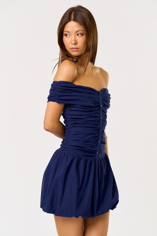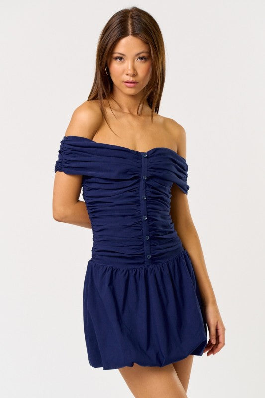 Turn heads in this chic off-shoulder mini dress, featuring a classic button-down front and a flirty bubble skirt that adds playful volume. Perfect for brunch dates or summer soirées, this effortlessly feminine silhouette blends timeless charm with modern flair.
