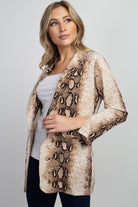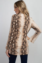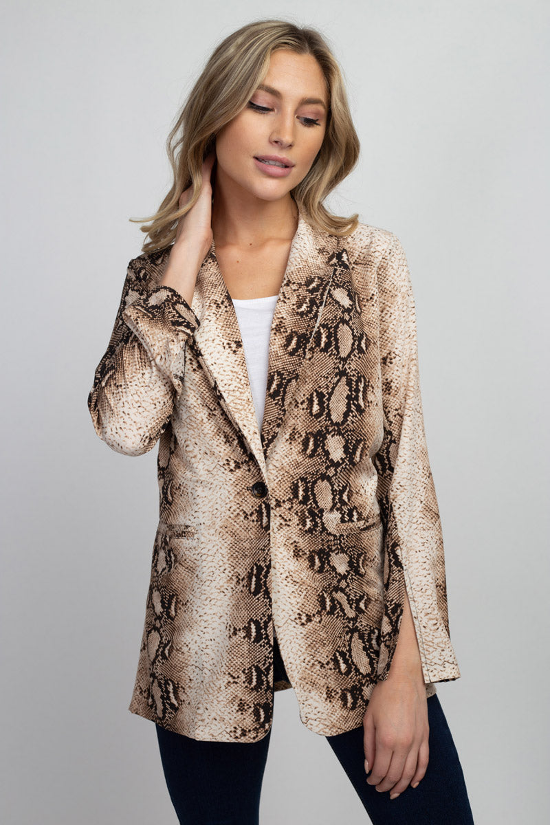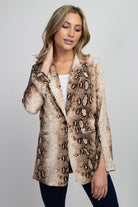 Make a bold statement with this sleek snakeskin blazer. Featuring long sleeves with subtle wrist slits, a classic collared neckline, and a polished button-front closure, this piece blends edgy flair with timeless tailoring. Perfect for elevating both casual and dressy looks, it’s your go-to for confident, standout style.
