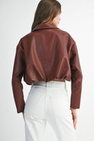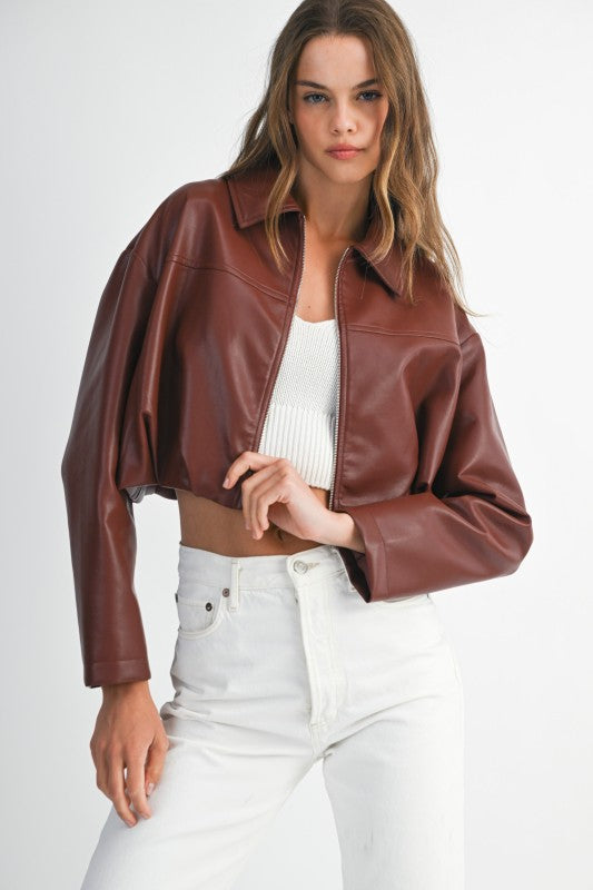 Add a bold edge to your wardrobe with this faux leather-collared cropped jacket. Featuring a pleated bubble hem and a sleek exposed front zipper, this statement piece brings structure and style in equal measure. The cropped silhouette adds a modern twist, while the faux leather collar gives it that effortlessly cool vibe. Perfect for layering over anything from dresses to denim.