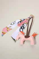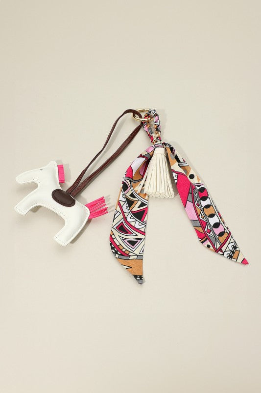 Add a playful pop to your everyday accessories with this Faux Leather Horse Tassel Scarf Keychain / Bag Charm. Crafted with soft faux leather, this whimsical horse design features vibrant tassel detailing and a silky printed scarf accent for a touch of flair.