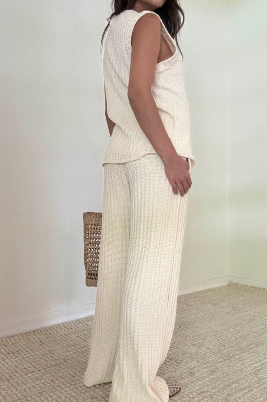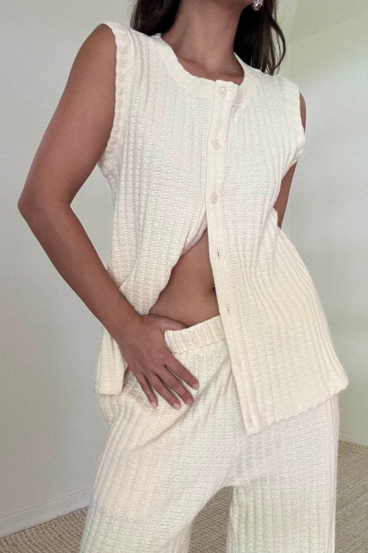 This chic pant set combines utility-inspired details with a sleek, modern silhouette. The sleeveless top features a flattering longline hem and a timeless button-down front. Paired with wide-leg pants designed with a high elastic waist, this set offers a perfect balance of structure and ease—ensuring all-day comfort without sacrificing style. Whether you're heading out or lounging in, this versatile duo keeps you looking polished and feeling confident.