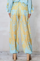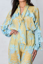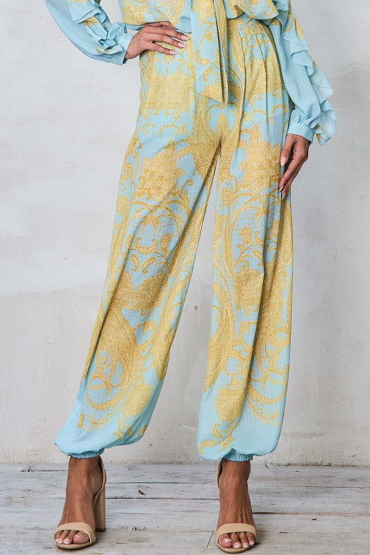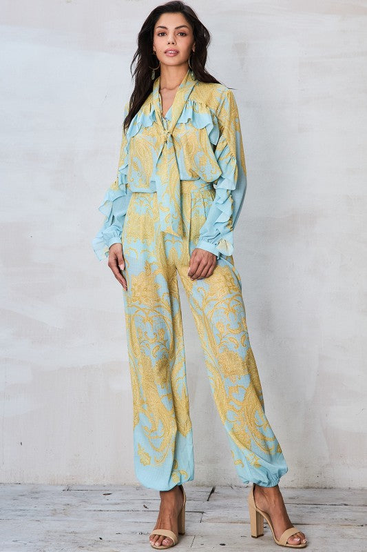 This effortlessly chic pant set features a long-sleeve blouse adorned with an allover paisley print, bringing timeless pattern and visual interest to the look. Delicate ruffle trim along the shoulders and sleeves adds soft movement and romantic detail, while the V-neckline is finished with a button-front closure and subtle tie accent for a flattering, customizable fit. The coordinating high-waist pants flow beautifully with a relaxed, wide-leg silhouette, creating an elegant balance of comfort and sophistication. Perfect for everything from daytime events to elevated evenings, this set is a standout in any wardrobe.
