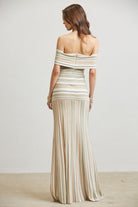 This maxi dress is crafted from a multicolored striped knitted fabric that brings bold dimension and movement to the silhouette. The fold-over off-the-shoulder neckline highlights the top with an effortless, feminine feel, while the drop-waist design creates a relaxed yet flattering shape. Finished with a rib-textured knitted skirt that drapes beautifully and an invisible back zipper for a seamless fit, this piece balances statement style with all-day comfort—perfect for everything from daytime events to elevated evenings out.