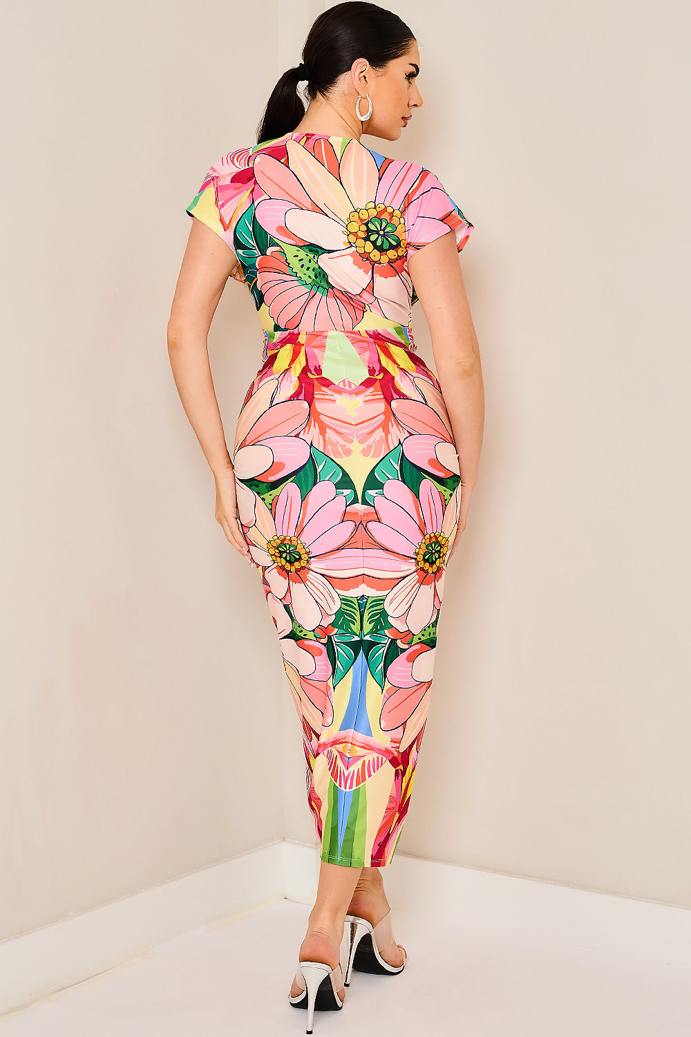 Discover elegance with a playful twist in our printed V-neck midi dress. The dress features a flattering V-neckline that leads into a gracefully draped silhouette, highlighted by a carefully crafted front pleated detail that adds movement and sophistication. A daring deep slit at the front infuses a hint of allure, making it the perfect choice for those ready to make a memorable entrance.