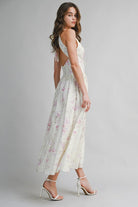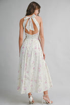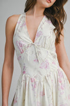 This floral printed midi dress features a flattering V halter neckline that beautifully frames the shoulders and neckline. Designed with a graceful, feminine silhouette, it flows effortlessly with every step while the vibrant floral print adds a fresh, romantic touch. Perfect for daytime events, garden parties, or warm-weather evenings, this dress pairs effortlessly with sandals or heels for an elevated yet easy look.