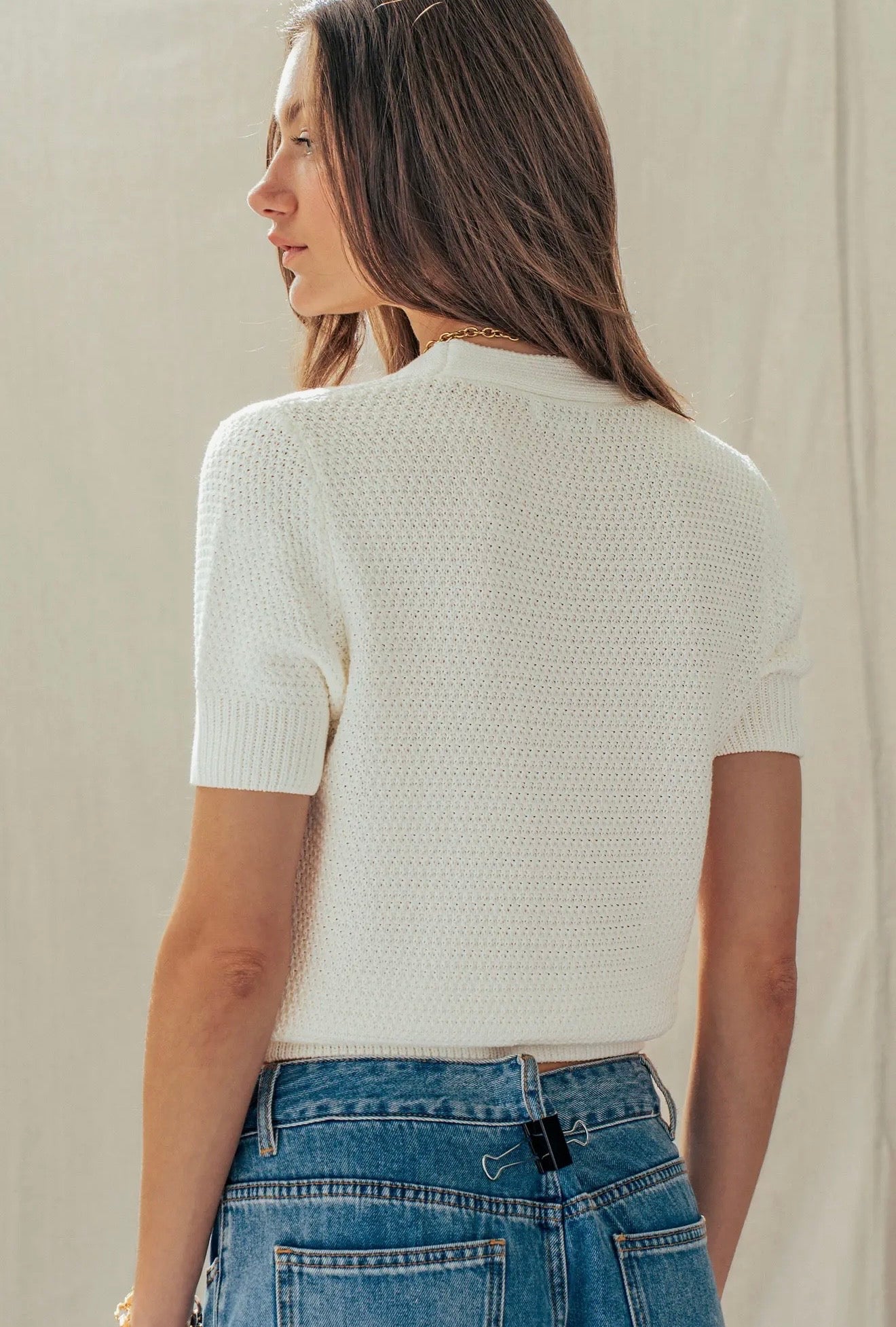 Coastal-inspired and effortlessly charming, this knit top brings a playful twist to a classic silhouette. Featuring a soft, lightweight knit with a flattering V-neckline and short sleeves, it offers a comfortable, easy fit. The standout detail is the unique button accents, designed with seashell and starfish motifs for a touch of seaside elegance. Perfect for pairing with denim or dressing up with tailored pieces, this top adds a fresh, breezy feel to any look.