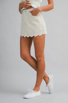 This eyelet mini skort blends flirty style with everyday ease. Designed with a flattering high waist, it features delicate eyelet detailing and a scalloped hem for a soft, romantic finish. The skort silhouette offers the look of a skirt with the comfort and confidence of built-in shorts, making it perfect for warm-weather days, weekend outings, or effortless summer styling.