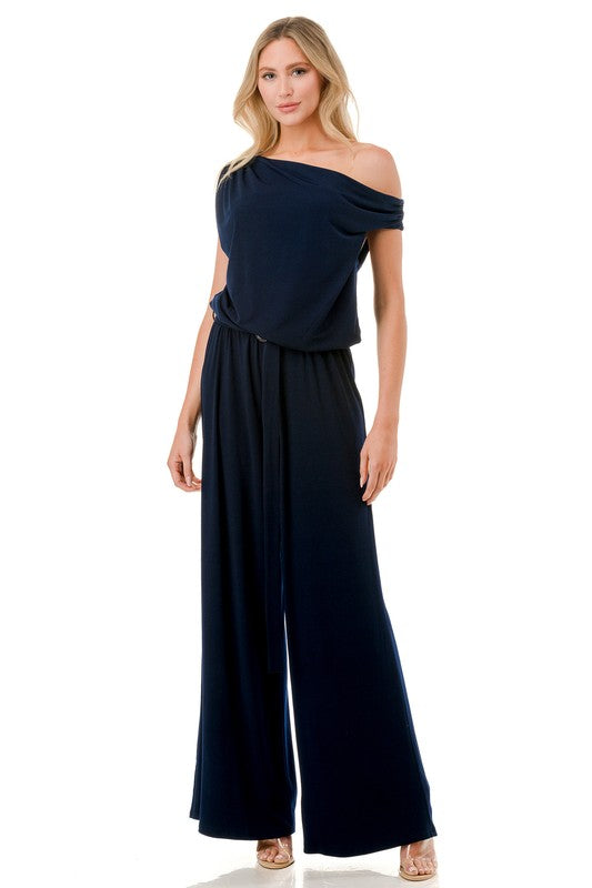 This elegant one-shoulder jumpsuit features a softly draped neckline that creates a sleek, asymmetrical silhouette. Designed with a relaxed bodice and an adjustable waist tie, it offers a flattering, customizable fit. The wide-leg pants flow effortlessly, adding movement and a refined, elongated look. Perfect for both casual and dressy occasions, this jumpsuit is a timeless piece with modern appeal.