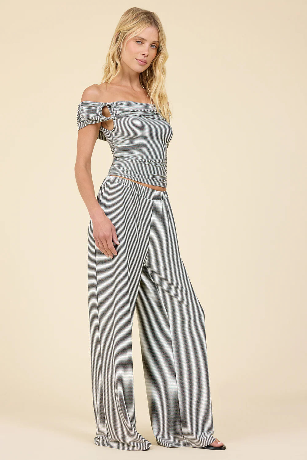 Effortlessly cool and comfortable, this striped pant set is perfect for laid-back days with a stylish edge. The off-the-shoulder top features a flattering, fitted silhouette with a subtle cutout detail for a modern touch. Paired with relaxed wide-leg pants, the set offers a flowy, easy fit that moves with you. Crafted in a soft, lightweight fabric, it’s ideal for everything from casual outings to relaxed weekend wear.