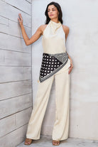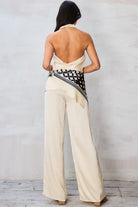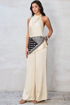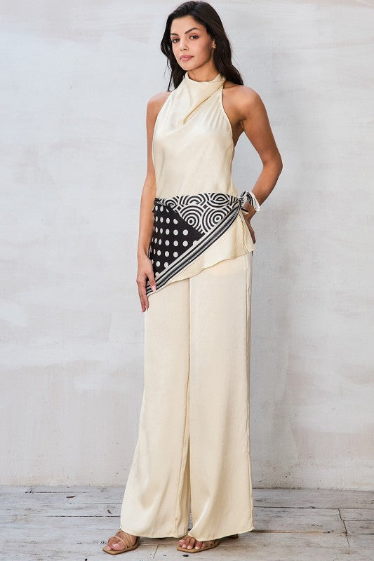 This silky pant set is the definition of effortless allure. The halter neck top features a dramatic low open back and a side scarf tie detail that adds soft movement and visual interest. Designed in a lightweight fabric, the coordinating wide leg pants drape beautifully for an elongated, flowy silhouette. Elegant yet striking, this set is perfect for evenings out, special occasions, or elevated resort styling.