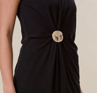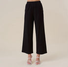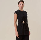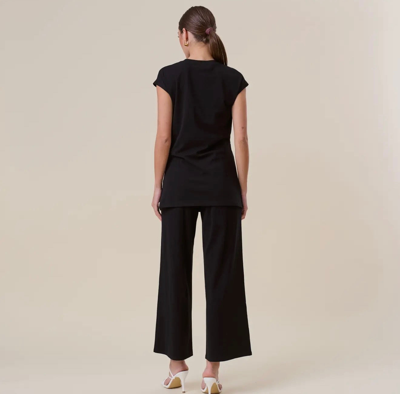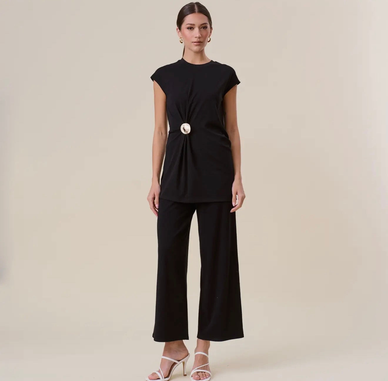 This elegant pant set pairs effortless sophistication with modern detail. The short sleeve top features soft gathered detailing that creates a flattering, feminine shape, finished with a chic gold brooch accent for a touch of polish and shine. The coordinating high-waist pants are designed with a wide-leg silhouette that flows beautifully, offering both comfort and a sleek, elongated look. Perfect for elevated everyday wear or special occasions, this set delivers timeless style with a refined finish.
