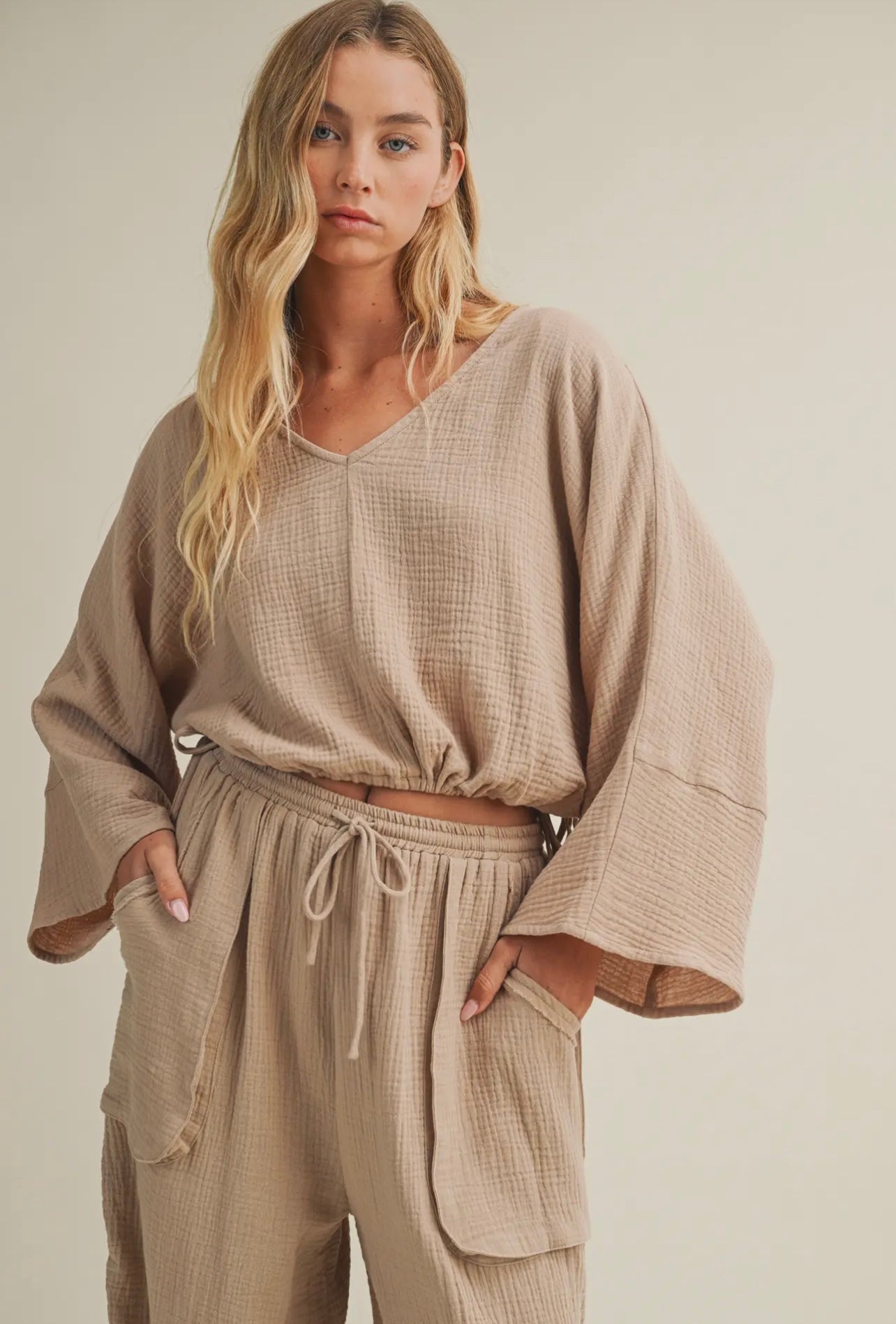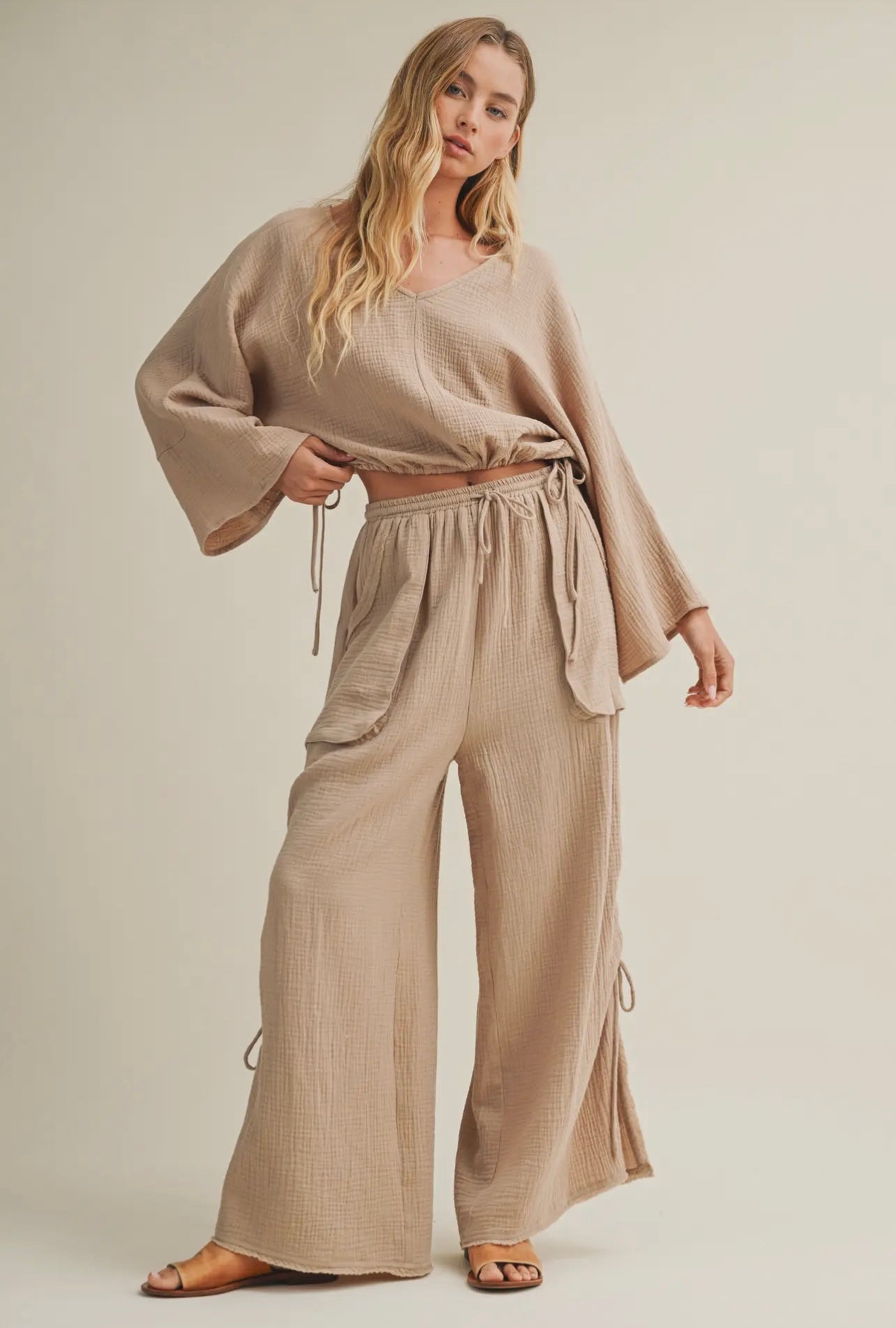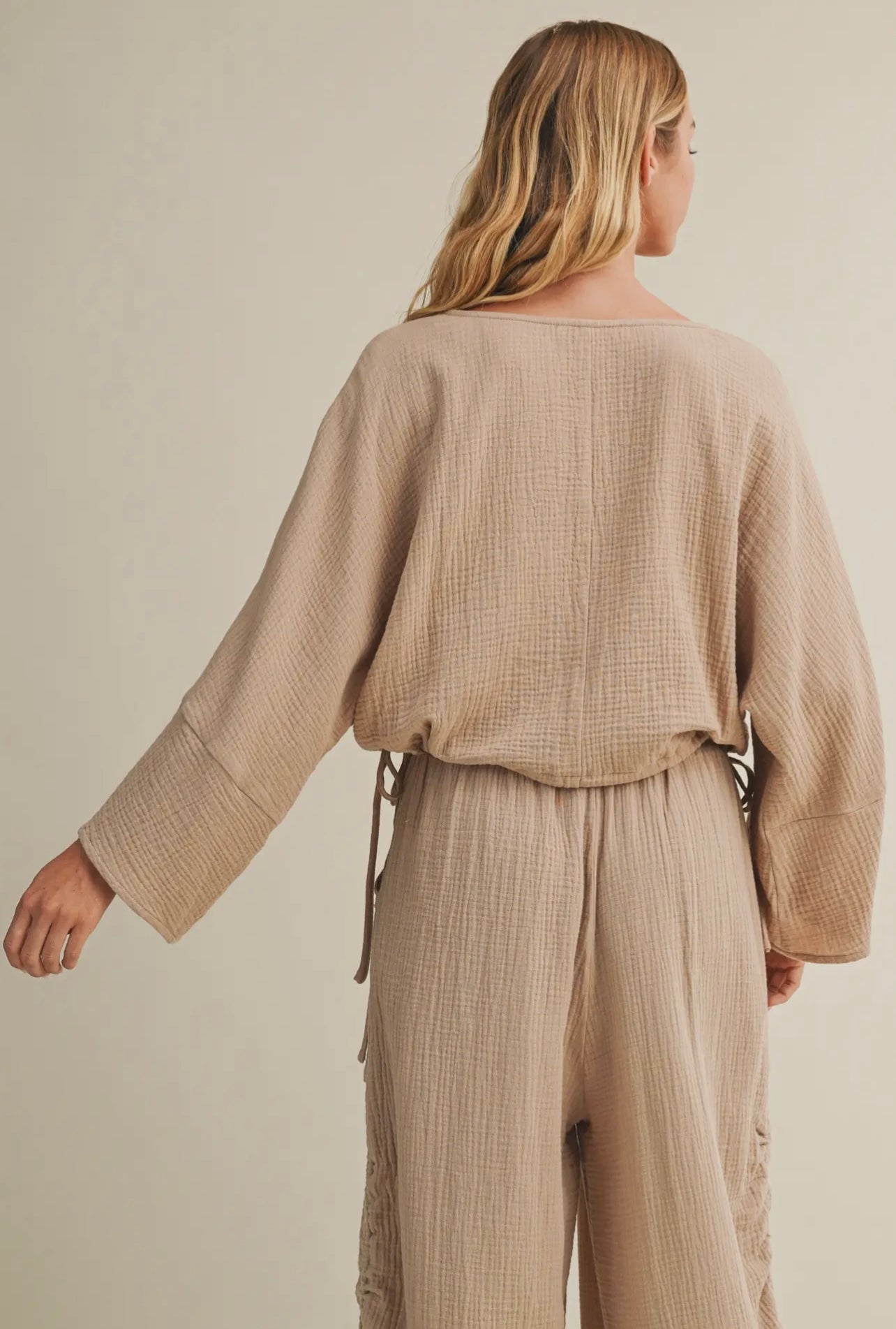 Gauze dolman sleeve top with cinching wide leg pant set
