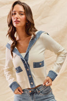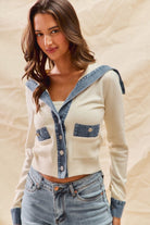Cozy meets cool in this denim-contrast cardigan sweater. Designed with classic front buttons and roomy front pockets, it combines effortless style with everyday comfort. The contrasting denim detailing adds a modern edge, making this cardigan a perfect layering piece for any season. Dress it up with tailored trousers or keep it casual with jeans for a timeless, laid-back look.