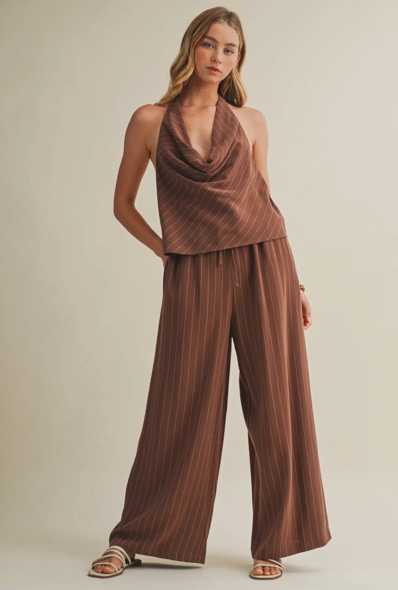 Stripe halter neck top with wide leg pant set
