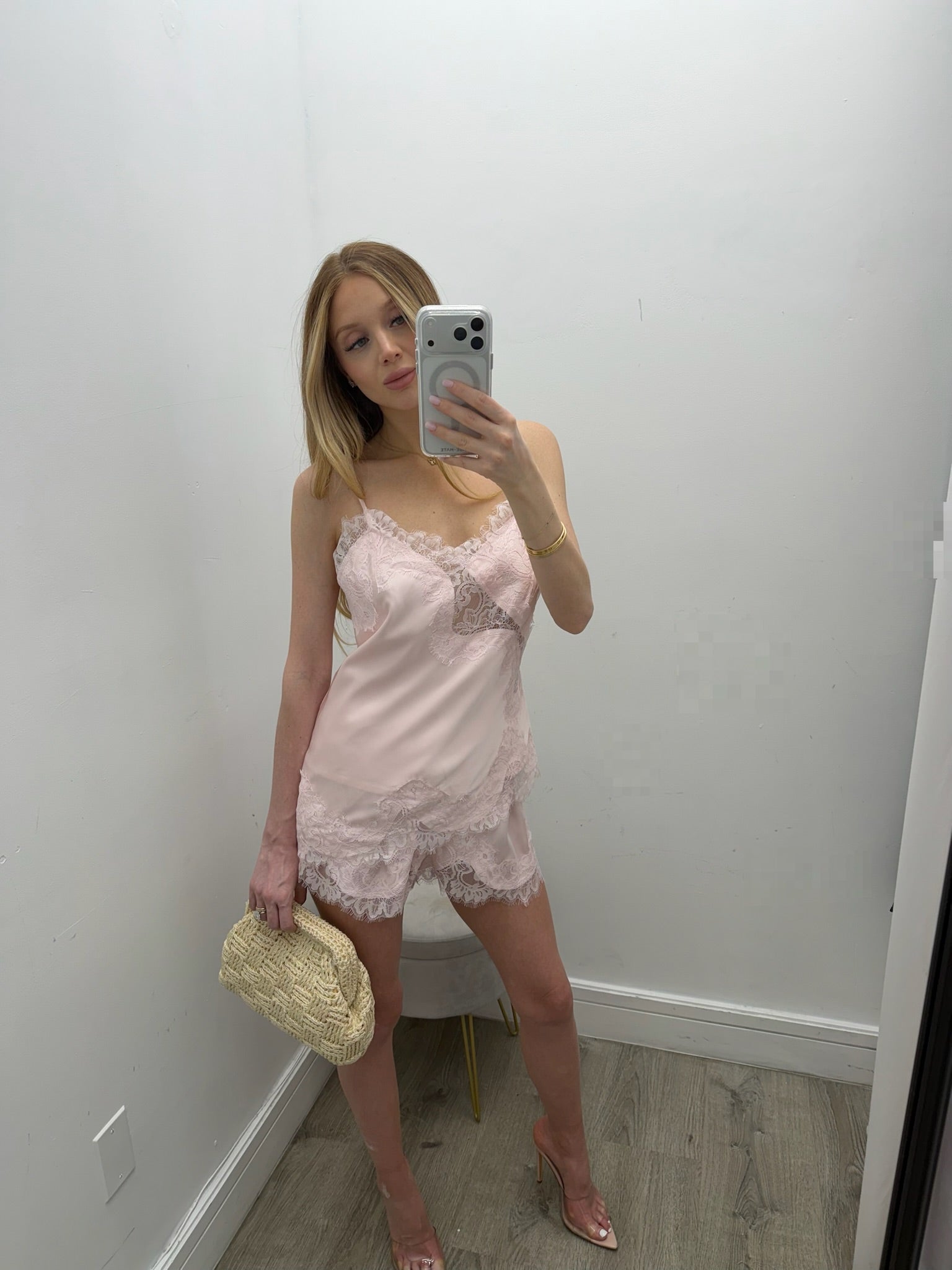 This silky short set blends effortless comfort with feminine elegance. The tank top features delicate lace detailing that adds a romantic touch, while the smooth, lightweight fabric drapes beautifully against the skin. Paired with coordinating shorts for an easy, relaxed fit, this set is perfect for warm-weather days, lounging in style, or elevated casual outings where comfort meets polish.
