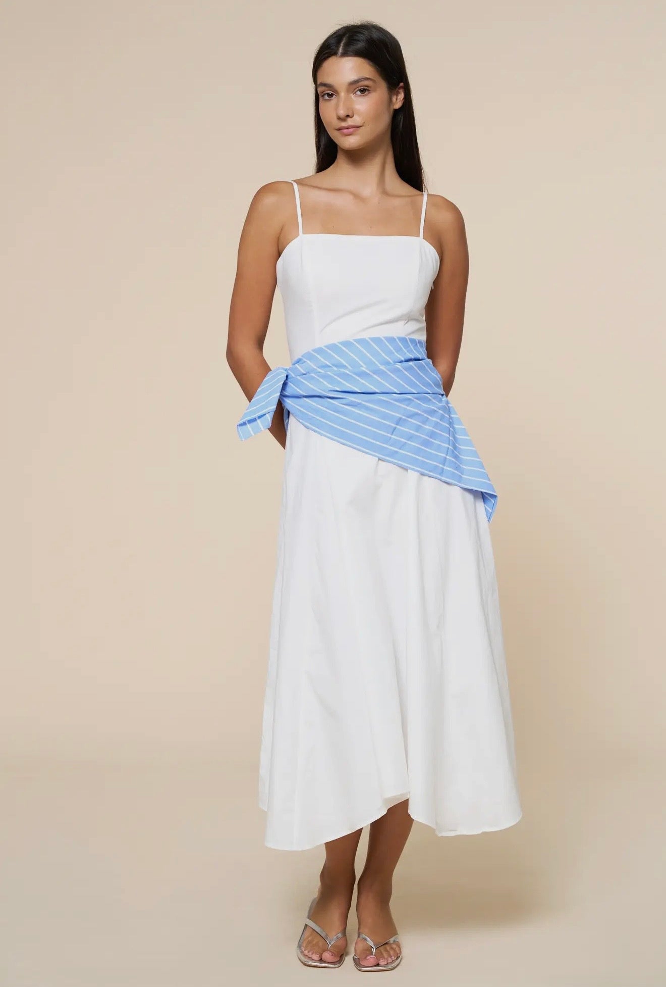 This spaghetti strap midk dress is the perfect blend of effortless elegance and relaxed summer style. Designed with a flowing silhouette, it features a striking striped bandanna-style waistband that defines the waist and adds a bold touch of contrast. The delicate spaghetti straps keep the look light and feminine, while the length creates graceful movement with every step. Perfect for sunny days, vacations, or casual evenings out, this dress offers an easy yet elevated look.