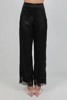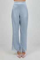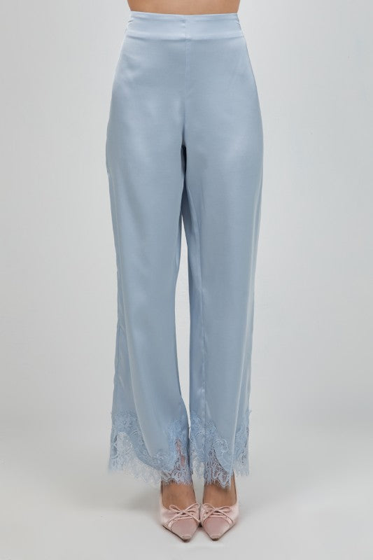 These satin straight-leg pants bring effortless elegance to any look with their smooth, silky finish and fluid drape. Designed with a timeless straight-leg silhouette, they’re finished with a delicate lace hem that adds a soft, feminine touch and subtle contrast. Perfect for dressing up with heels or styling casually with knits, these pants strike the perfect balance between sophistication and ease.