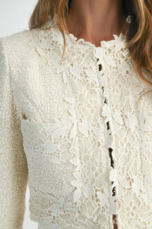 Chic and timeless with a romantic twist, this lace-trimmed textured tweed set features a cropped jacket adorned with delicate floral appliqués and a sleek hook-and-eye front closure. The matching high-waisted shorts are finished with a side invisible zipper for a seamless fit. Perfect for brunch dates, garden parties, or elevating your everyday look with feminine charm and structured sophistication.