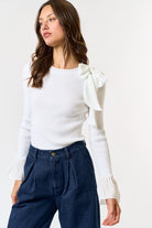 Add some fun to your wardrobe with the Abigail Ruffle Sleeve Sweater! The ruffle sleeve give this sweater a playful touch, while the bow on the shoulder adds a unique and quirky detail. Stay stylish and cozy all day long with this must-have sweater!