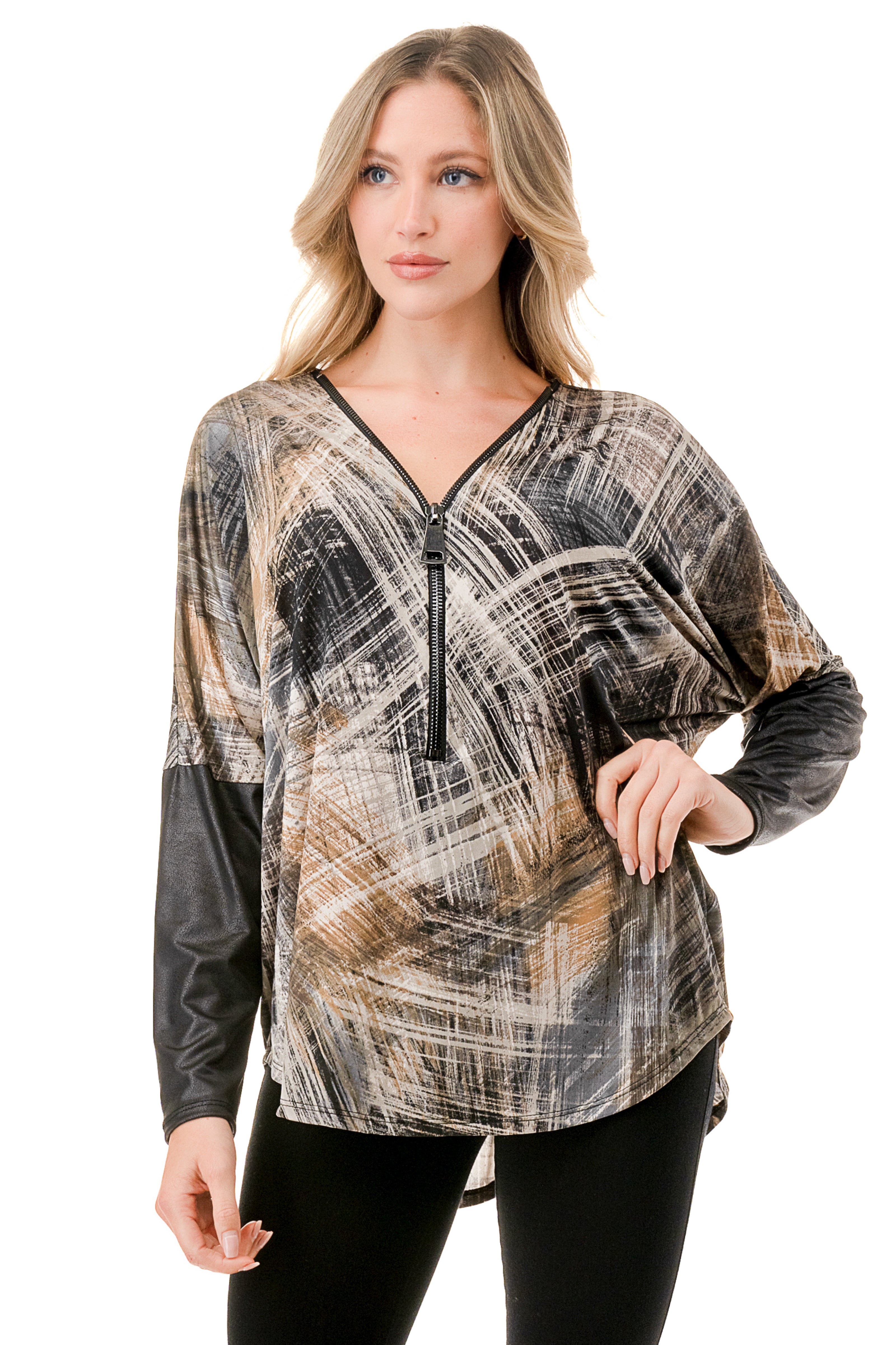Step out in relaxed sophistication with this must-have dolman sleeve zipper top. Its loose, dolman sleeves offer comfort and a breezy silhouette, while the stylish zipper detail adds an edgy, modern flair. Versatile enough for both casual days and dressier nights, pair this top effortlessly with denim or tailored bottoms for a chic, contemporary ensemble.