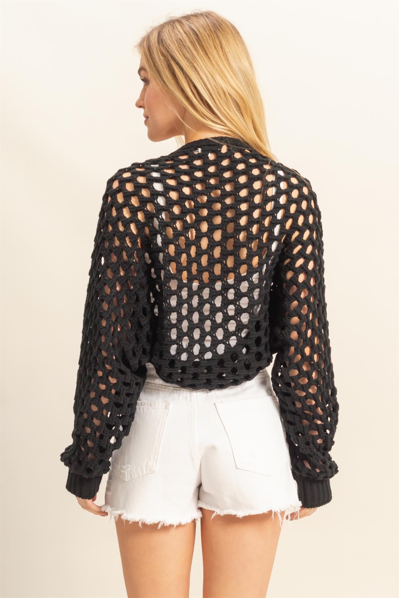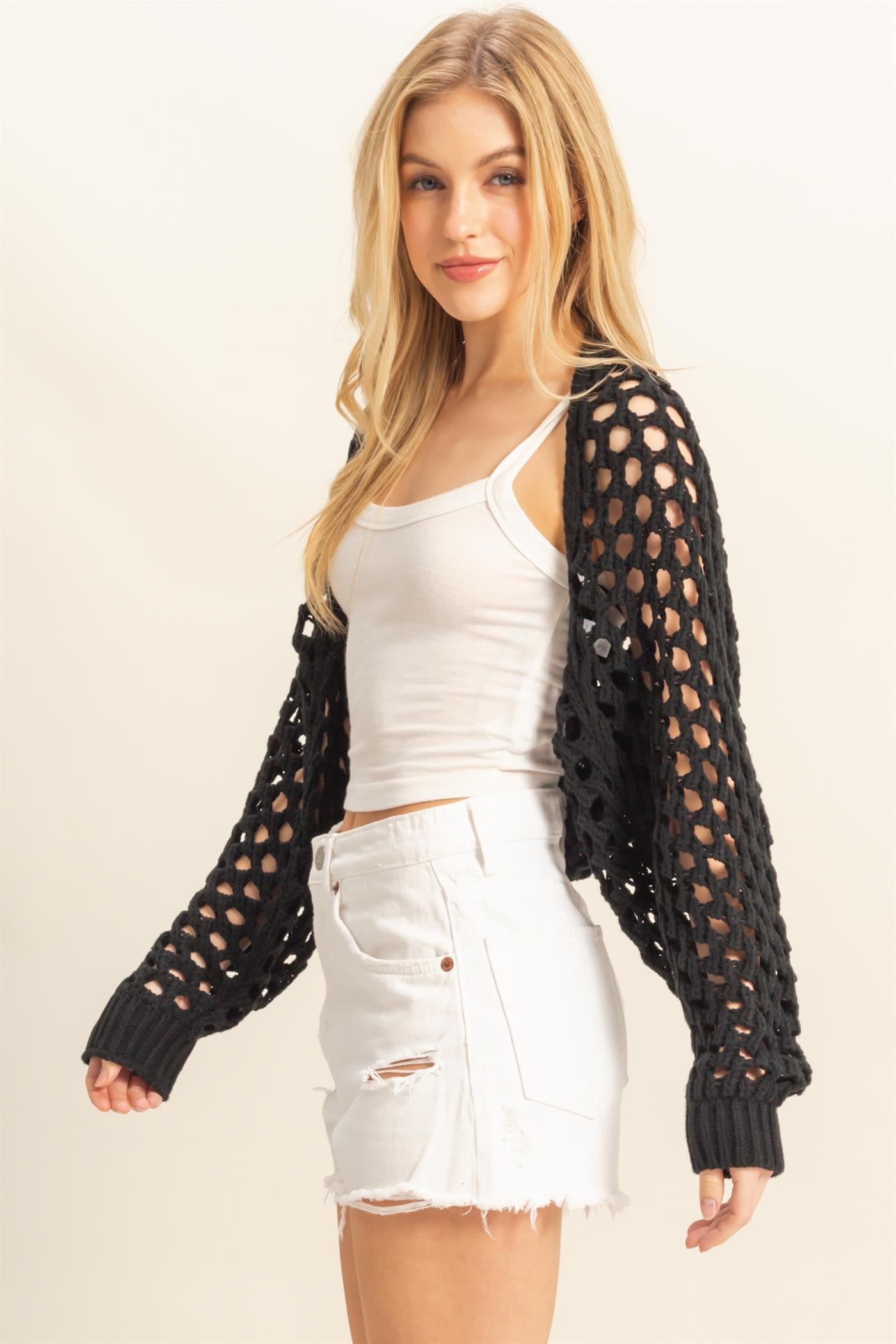 Elevate your casual looks with this charming bolero cardigan. Featuring a delicate open-stitch knit construction, it boasts a stylishly cropped silhouette and long sleeves that add a touch of effortless elegance. Ideal for layering, this cardigan pairs perfectly over a cami top and shorts for a breezy, relaxed vibe that's equally chic and cozy.