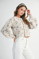 Romantic texture meets timeless charm in this floral jacquard knit cardigan jacket. Designed with voluminous balloon sleeves and a button-down front, it exudes effortless femininity. The ruffled placket detail adds a soft, elegant touch, while the structured knit offers both warmth and shape. Perfect for layering over dresses or pairing with tailored pants, this piece brings a sophisticated flourish to any look.