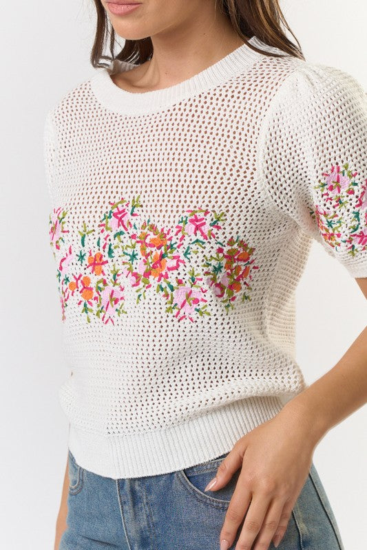 Elevate your style with our Short Puff Sleeve Embroidered Floral Crochet Top. Crafted from open crochet knit material, this breezy piece features intricate floral embroidery detailing on the front and sleeves. The playful short puff sleeves add a touch of whimsy, making it perfect for sunny days and cool evenings alike. Whether dressed up or paired with your favorite jeans, this top is a standout statement in any wardrobe.