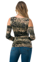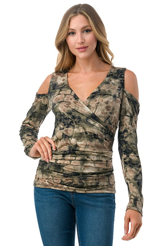 Step out in style with this charming cold-shoulder ruched detail top. Featuring an eye-catching print and elegant long sleeves, this top beautifully combines contemporary fashion with timeless comfort. Crafted from stretchy fabric, it provides a flattering fit while ensuring ease of movement. The ruched detailing adds texture and sophistication, making it perfect for both casual gatherings and evening outings. Pair effortlessly with jeans, skirts, or tailored pants for an effortlessly chic ensemble.