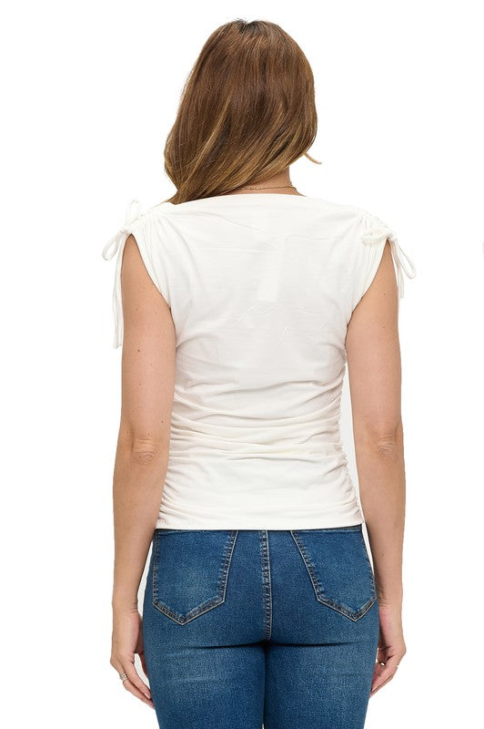 Upgrade your look with this effortlessly chic top. Designed with adjustable ruched shoulder ties and crafted from soft, stretchy fabric, it provides a comfortable yet flattering fit. The elegant cowl neck gracefully drapes, adding a touch of sophisticated charm to your ensemble. Perfect for casual date nights, or special occasions, this versatile piece pairs beautifully with jeans, skirts, or tailored trousers for a polished, stylish appearance.