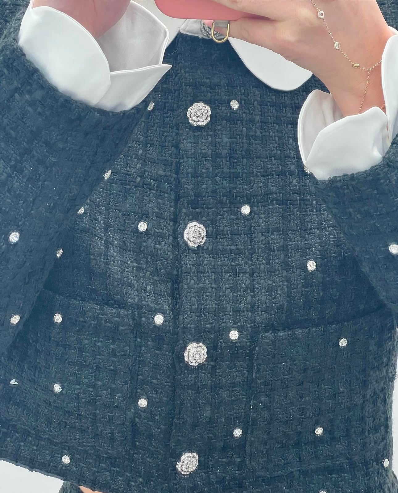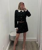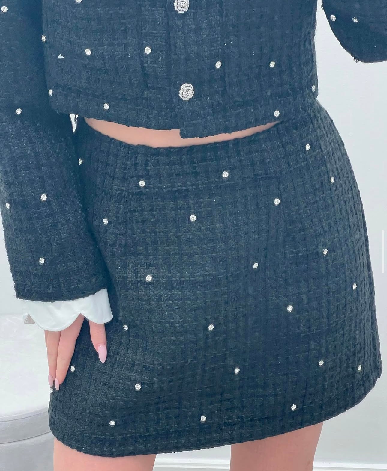Look effortlessly chic in the Kenzie Tweed Skirt Set. This timeless two-piece set features a sleek skirt with eye-catching jewel buttons that add a touch of elegance.