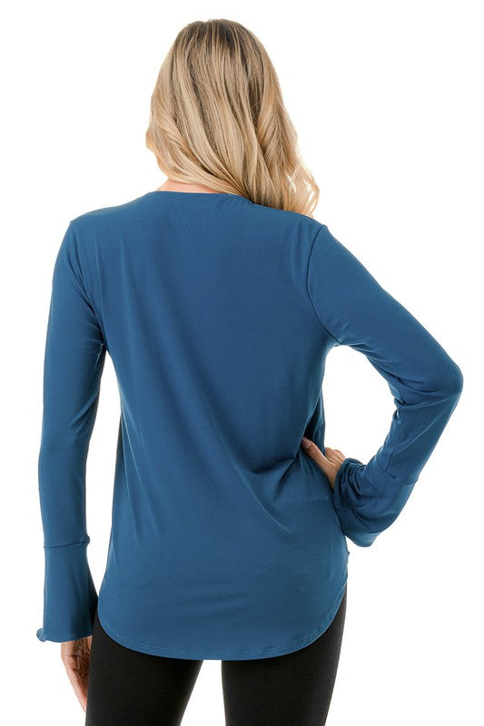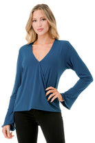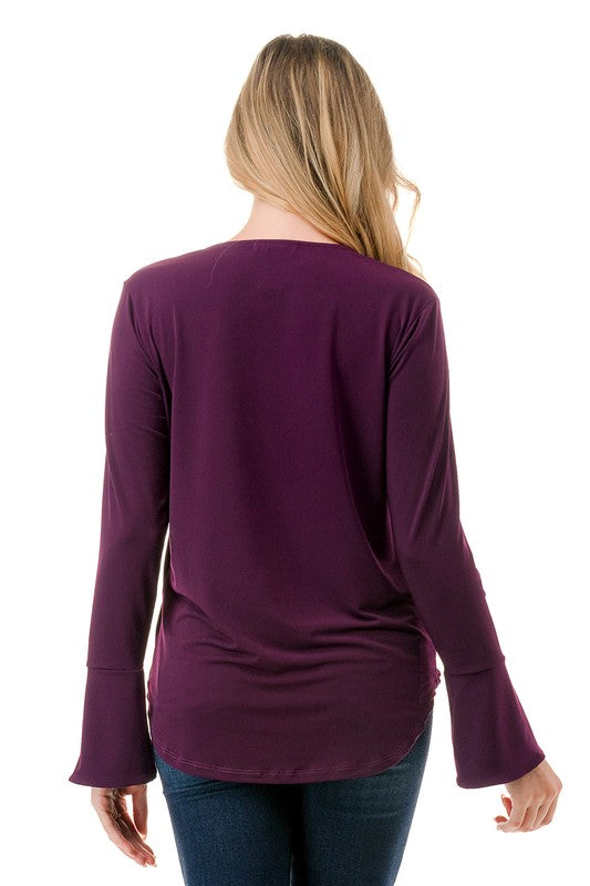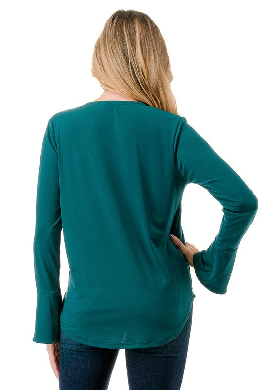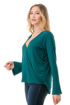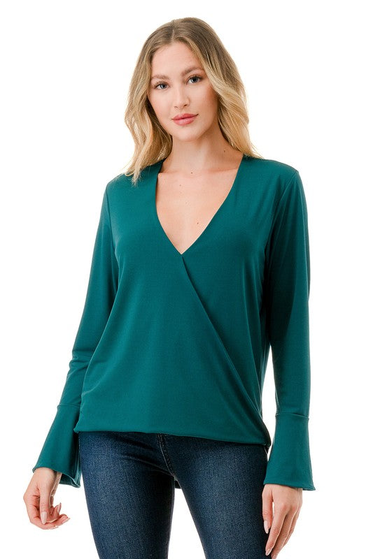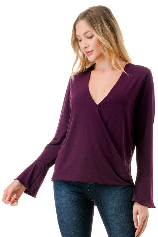 Effortlessly stylish and irresistibly feminine, this surplice bell sleeve top is the perfect addition to your wardrobe. Featuring an elegant crossover front that creates a flattering silhouette, and long, flowing bell sleeves for a touch of graceful charm. Ideal for casual days or dressier nights out, pair it with jeans or a skirt for an instantly polished, chic look.