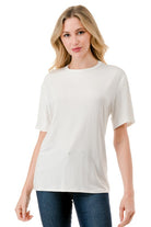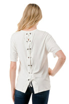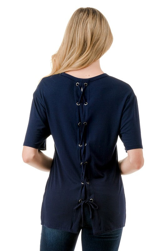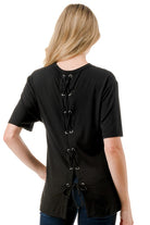 Add a touch of allure to your casual look with this stylish lace-up back T-shirt. Featuring a classic crewneck and short sleeves, this top combines everyday comfort with a playful, eye-catching detail. The lace-up design at the back offers a hint of unexpected elegance, elevating a simple silhouette into something effortlessly chic. Pair it easily with jeans, shorts, or skirts for an easy-going yet captivating ensemble.