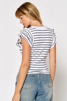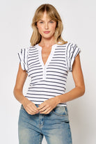 Upgrade your wardrobe with our stylish Stripe Henley Top. Featuring a flattering V neckline and playful ruffled flutter sleeves, this top combines classic charm with a feminine twist. Made from a soft and stretchy blend of cotton, modal, and spandex, it also offers a comfortable and figure-flattering fit. Get ready to turn heads with this casual yet chic addition to your collection.