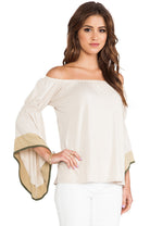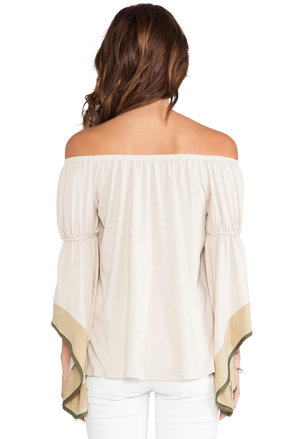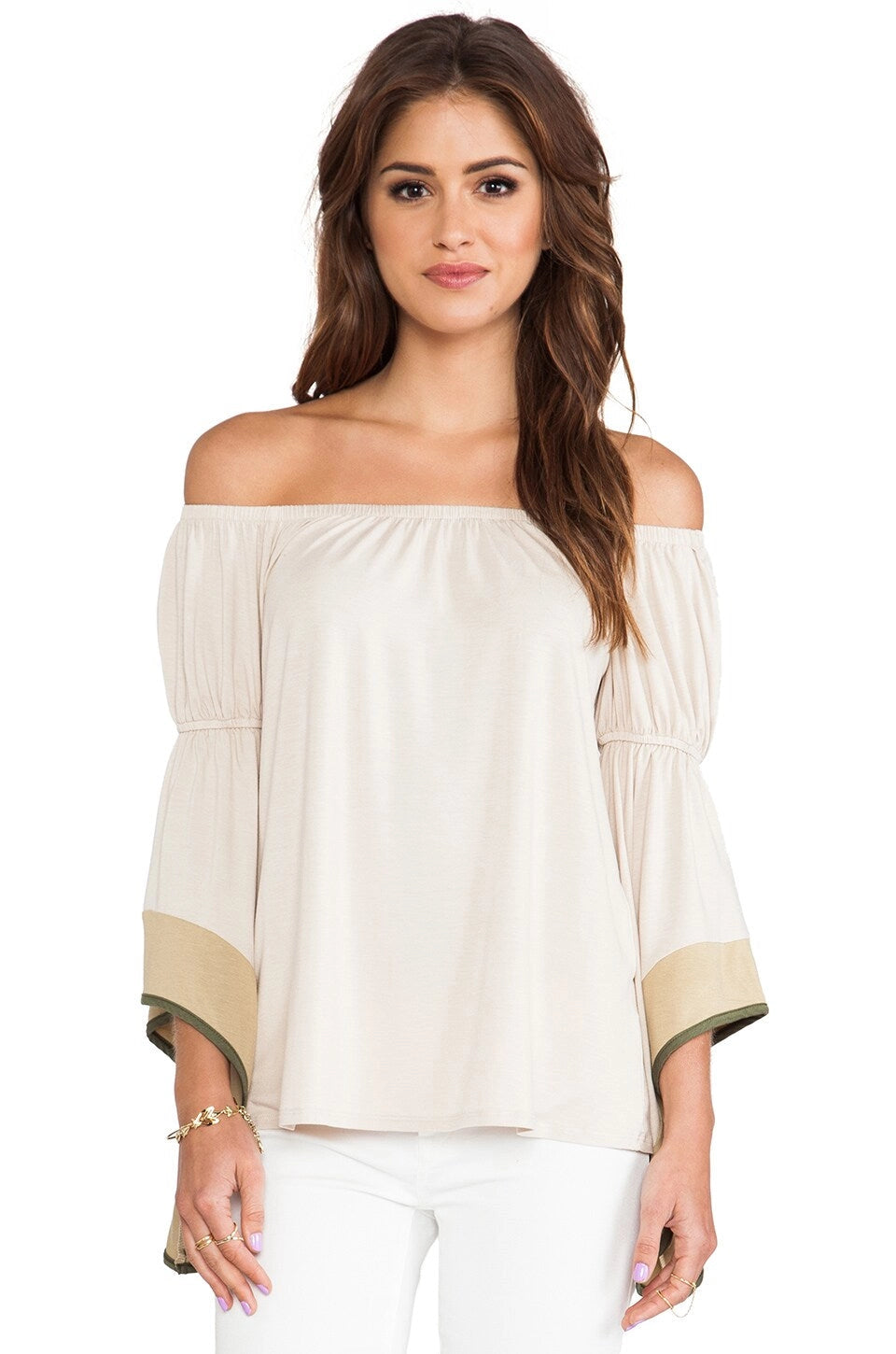 Embrace understated elegance with this taupe shirt, thoughtfully designed for modern style and comfort. The elasticized off shoulder neckline ensures a snug yet relaxed fit, while the distinctive two-tone wrist color detail adds a playful, unexpected contrast. Perfect for transitioning from day to night, this versatile piece pairs effortlessly with both casual and dressier ensembles.