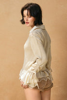 Elevate your everyday look with this effortlessly chic sweater featuring a partial satin blouse layer for a polished, layered effect. Designed with a classic collar and delicate lace trim, it blends sophistication with comfort. The relaxed, basic fit is complemented by subtle ruching on the sleeves, adding just the right amount of detail to this wardrobe essential. Perfect for workdays or weekends—just pair with jeans or trousers for instant style.
